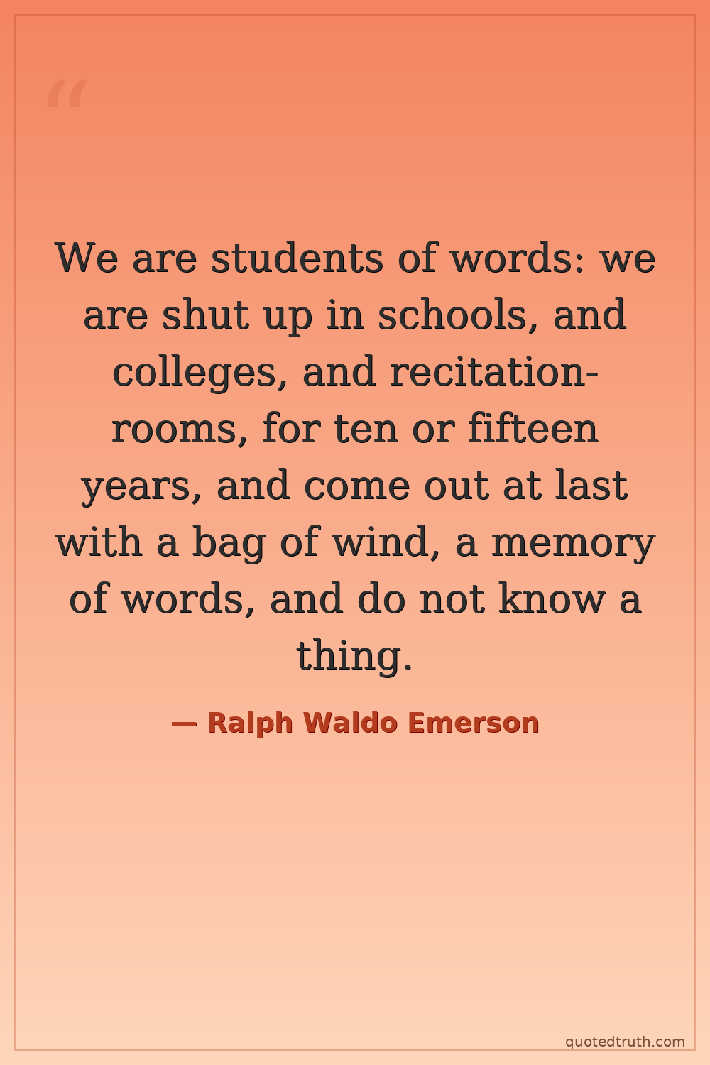 We are students of words: we are shut up in schools, and colleges, and recitation-rooms, for ten or fifteen years, and come out at last with a bag of wind, a memory of words, and do not know a thing.