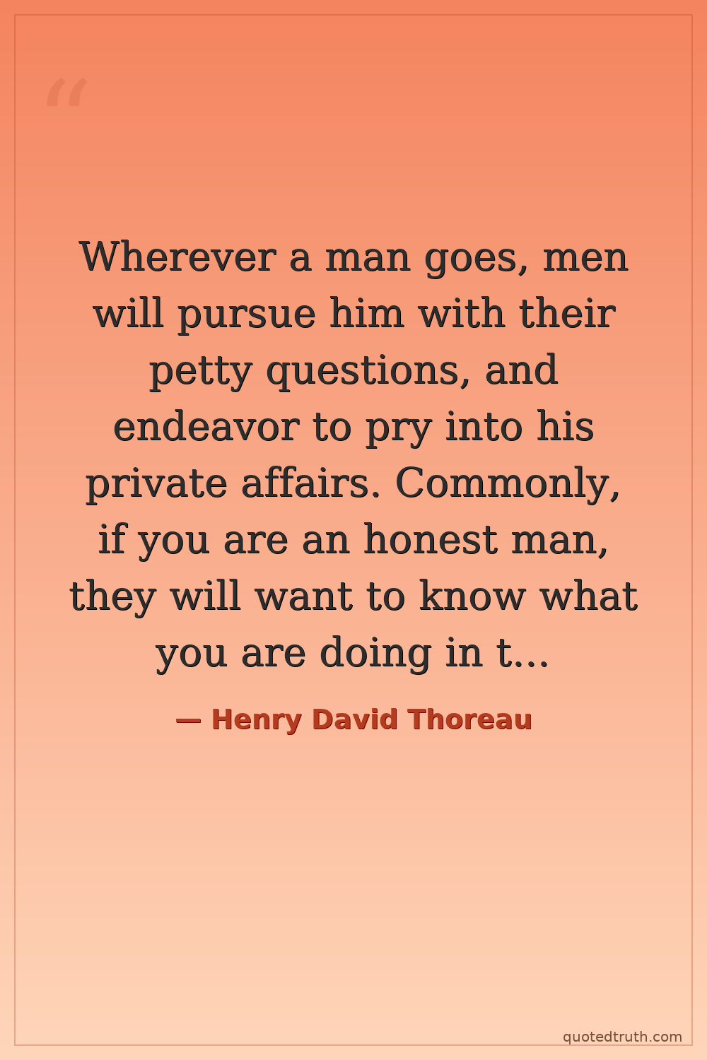 Wherever a man goes, men will pursue him with their petty questions, and endeavor to pry into his private affairs. Commonly, if you are an honest man, they will want to know what you are doing in their neighborhood.