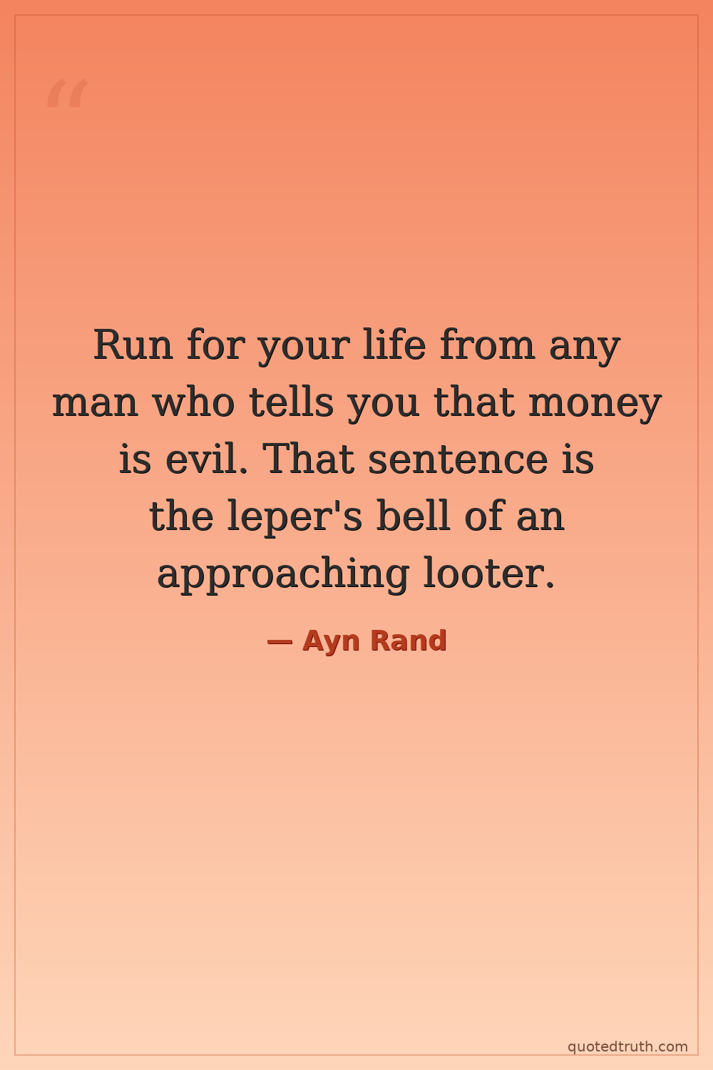 Run for your life from any man who tells you that money is evil. That sentence is the leper's bell of an approaching looter.