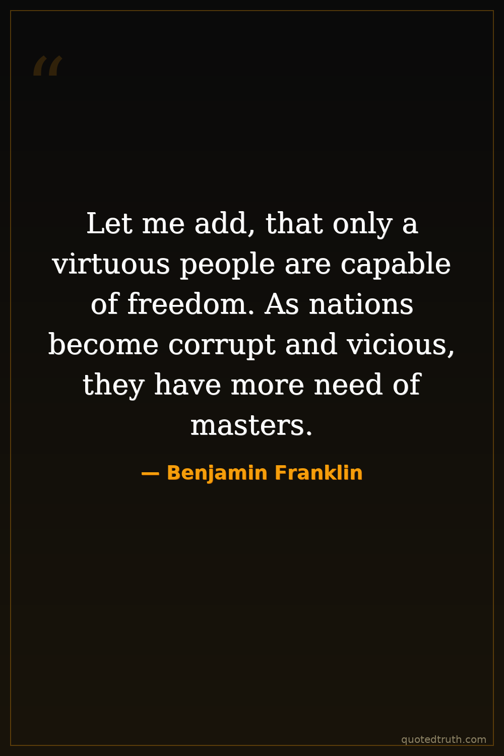 Let me add, that only a virtuous people are capable of freedom. As nations become corrupt and vicious, they have more need of masters.