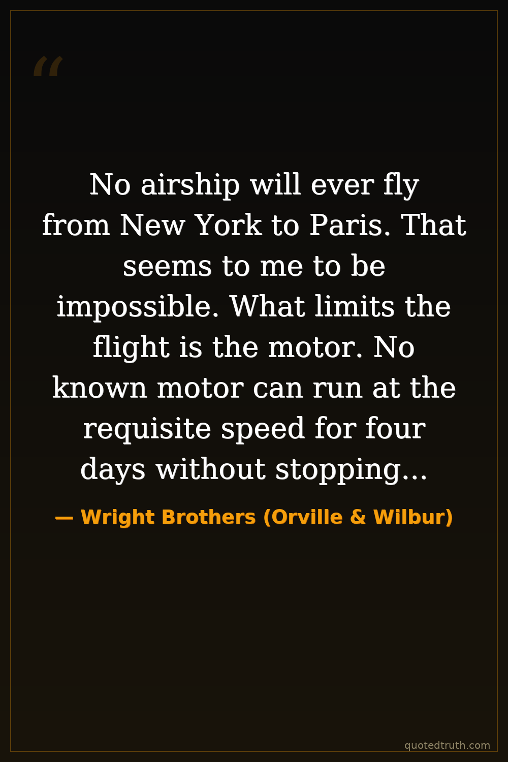 No airship will ever fly from New York to Paris. That seems to me to be impossible. What limits the flight is the motor. No known motor can run at the requisite speed for four days without stopping, and you can't be sure of finding the proper winds for soaring.