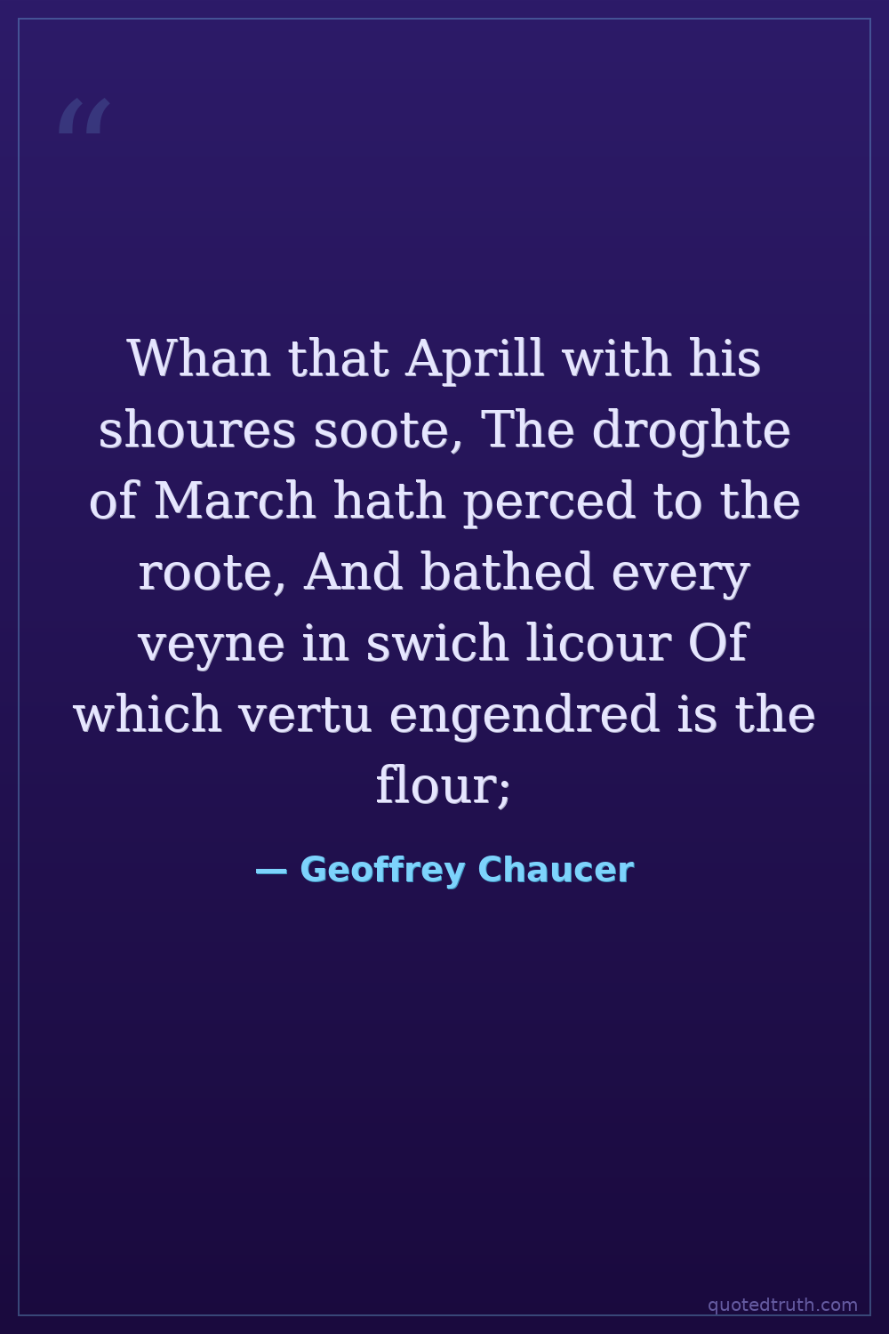 Whan that Aprill with his shoures soote, The droghte of March hath perced to the roote, And bathed every veyne in swich licour Of which vertu engendred is the flour;