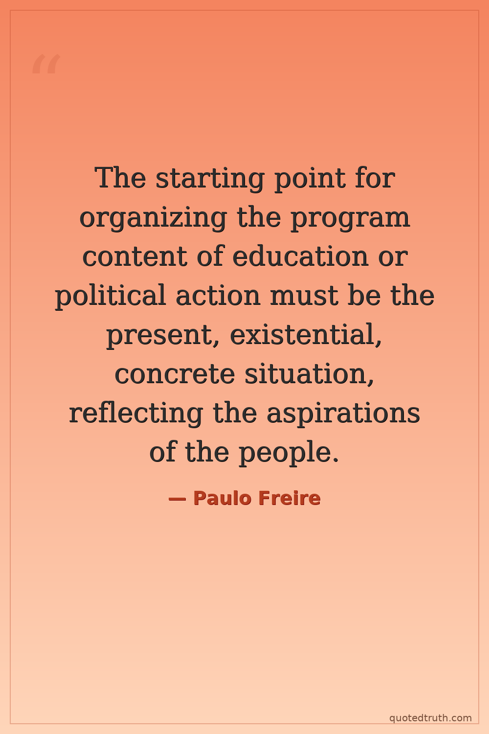 The starting point for organizing the program content of education or political action must be the present, existential, concrete situation, reflecting the aspirations of the people.