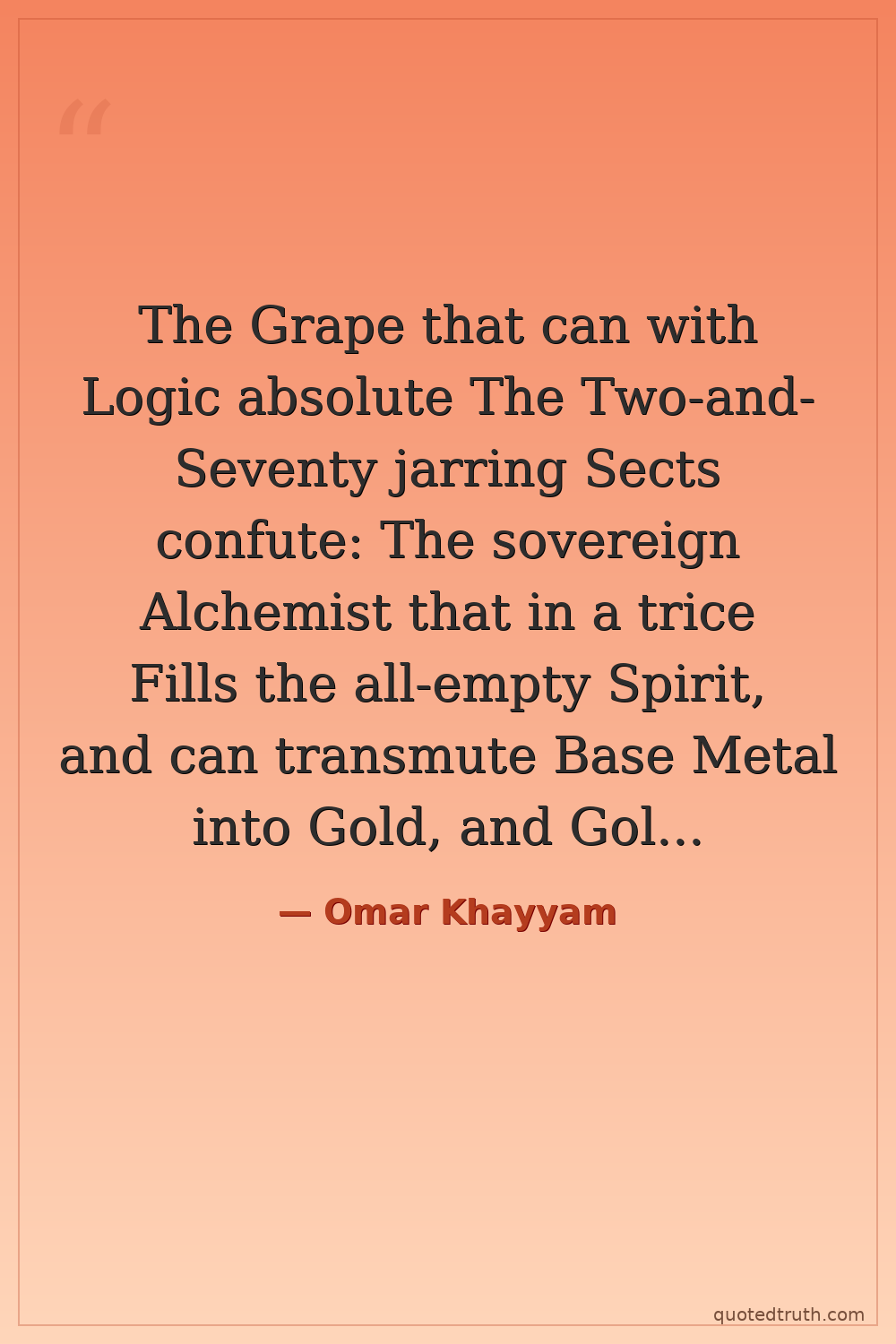 The Grape that can with Logic absolute The Two-and-Seventy jarring Sects confute: The sovereign Alchemist that in a trice Fills the all-empty Spirit, and can transmute Base Metal into Gold, and Gold to Life.