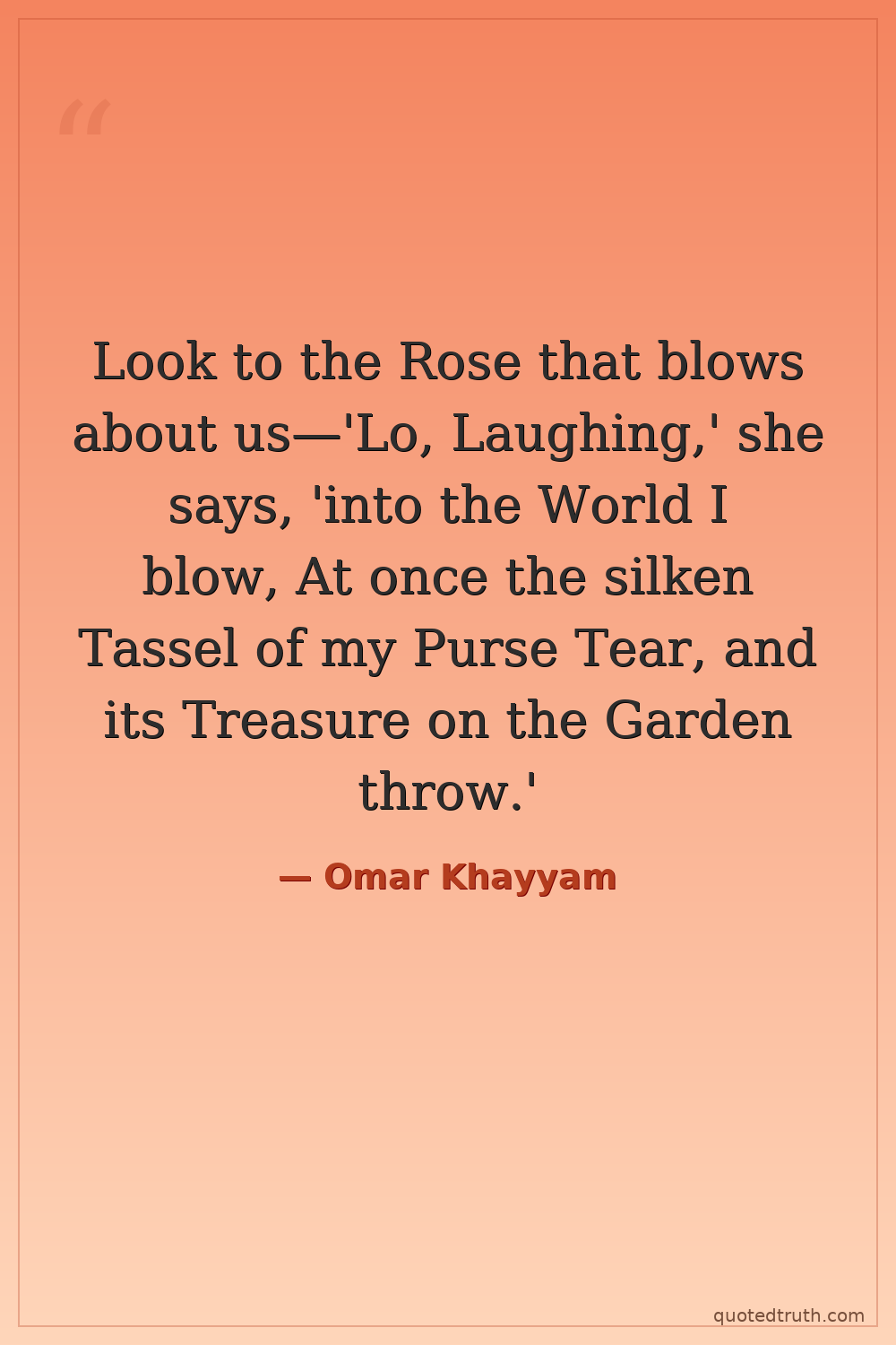Look to the Rose that blows about us—'Lo, Laughing,' she says, 'into the World I blow, At once the silken Tassel of my Purse Tear, and its Treasure on the Garden throw.'