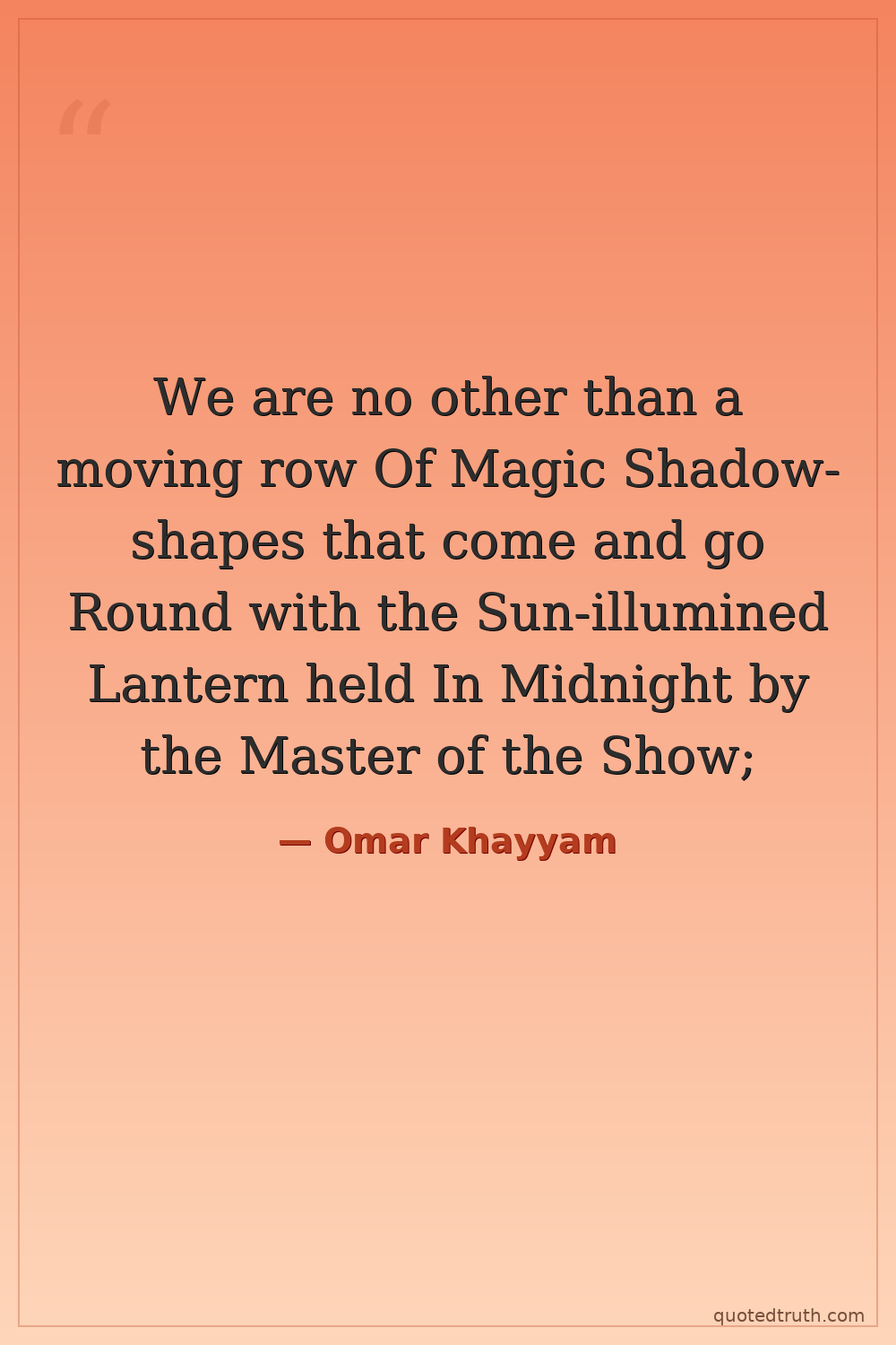 We are no other than a moving row Of Magic Shadow-shapes that come and go Round with the Sun-illumined Lantern held In Midnight by the Master of the Show;