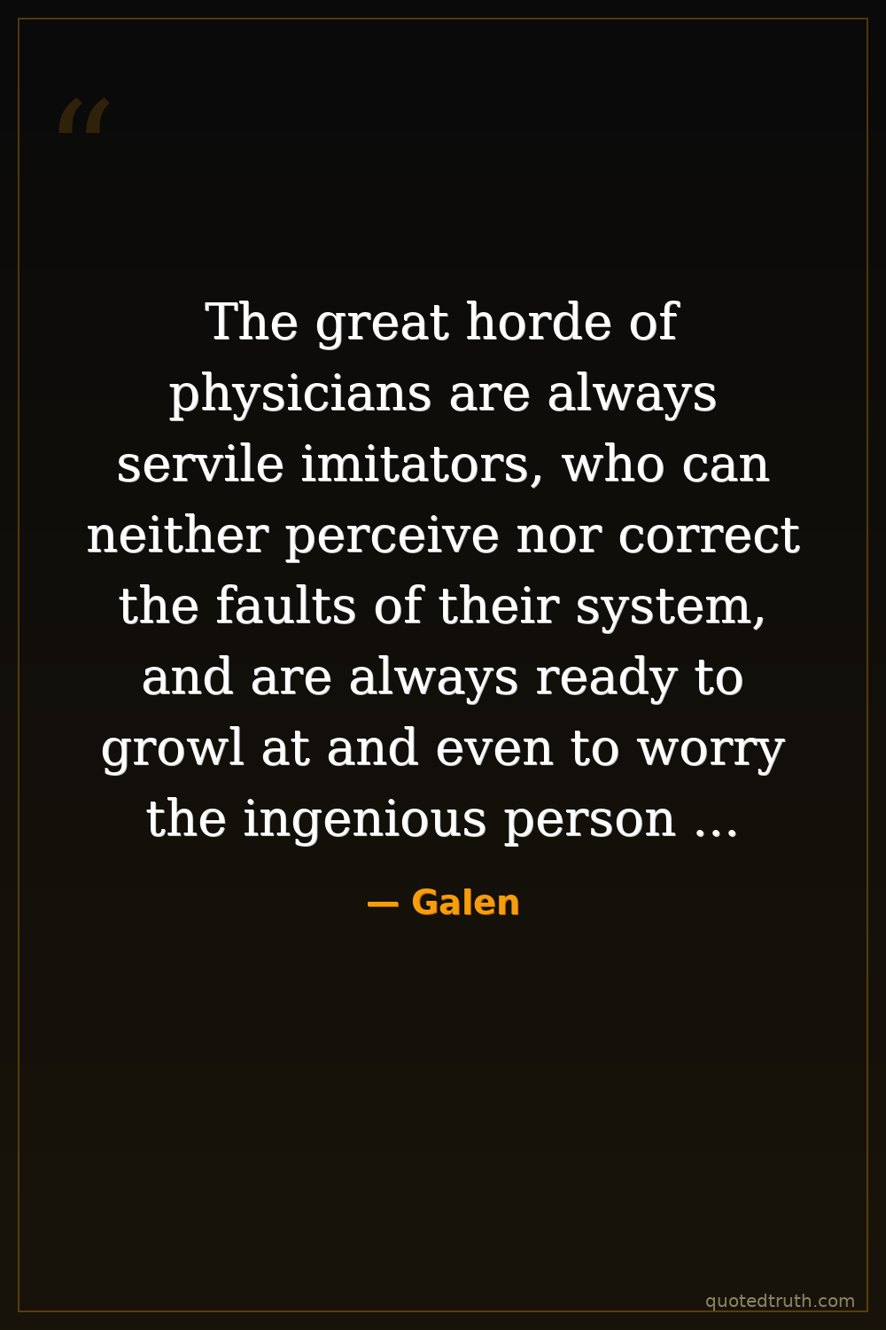 The great horde of physicians are always servile imitators, who can neither perceive nor correct the faults of their system, and are always ready to growl at and even to worry the ingenious person that could attempt it. Thus was the system of Galen secured in the possession of the schools of physic.