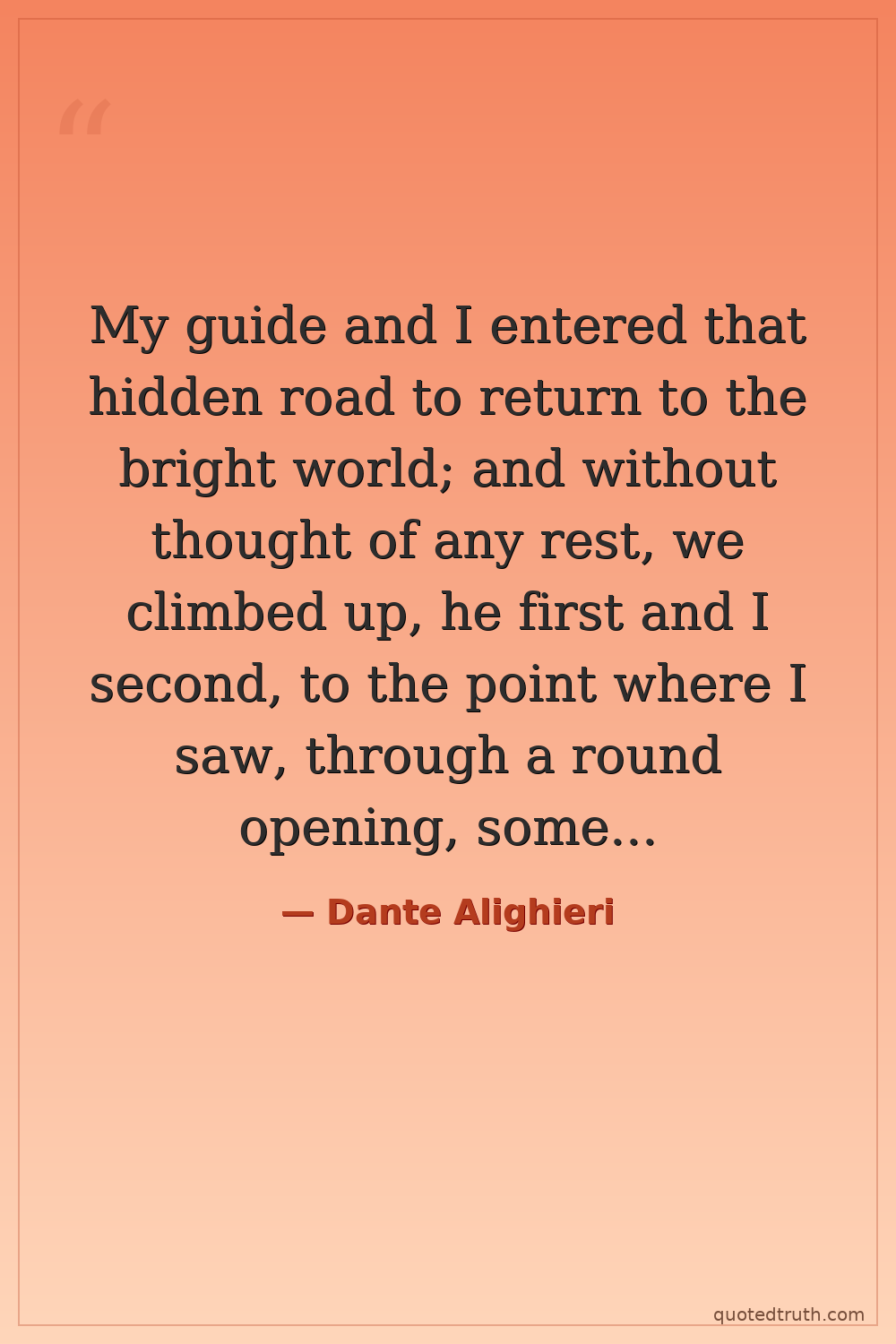 My guide and I entered that hidden road to return to the bright world; and without thought of any rest, we climbed up, he first and I second, to the point where I saw, through a round opening, some of the beautiful things that Heaven bears; and thence we came forth to rebehold the stars.