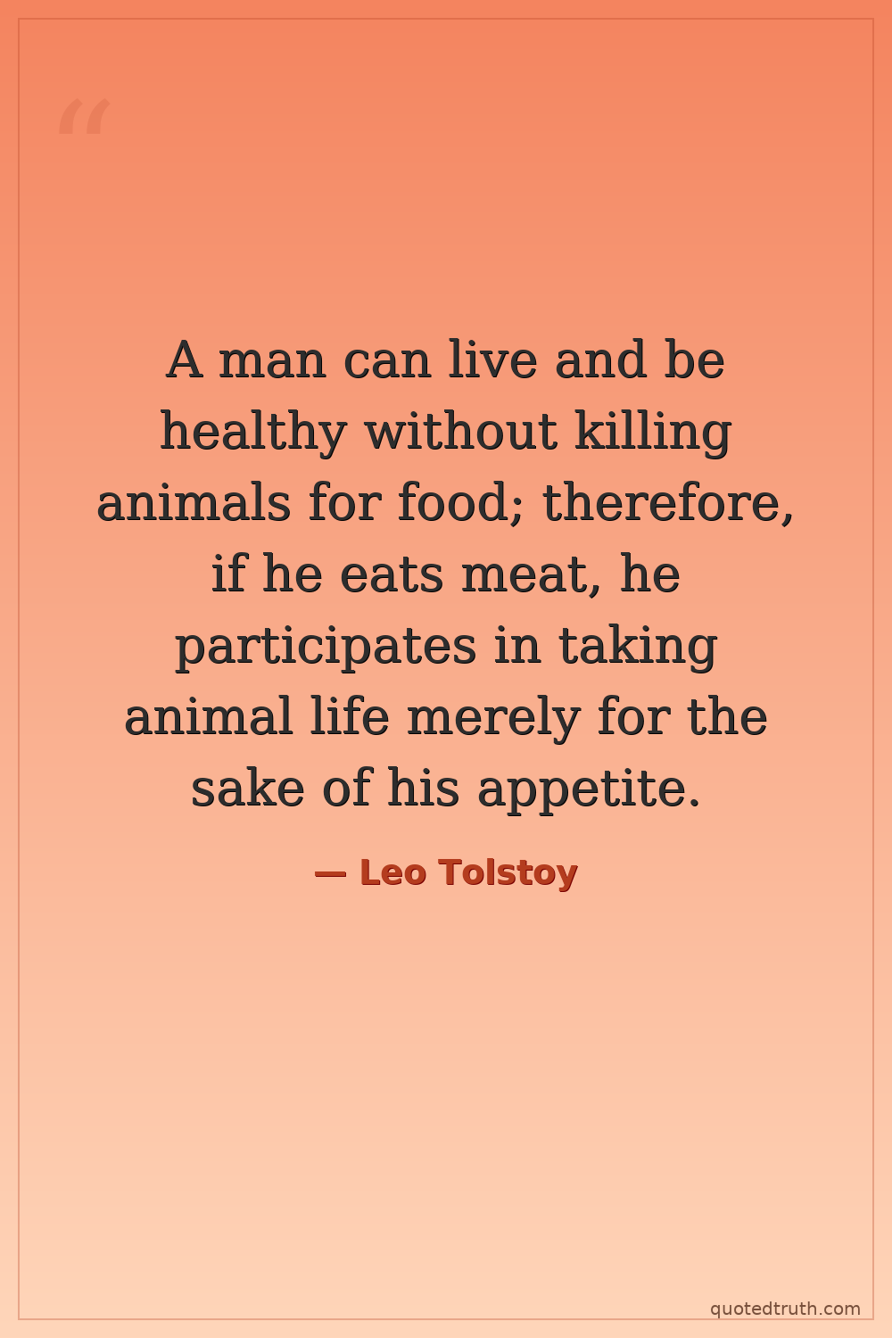 A man can live and be healthy without killing animals for food; therefore, if he eats meat, he participates in taking animal life merely for the sake of his appetite.