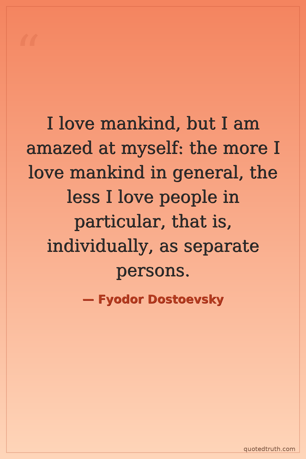 I love mankind, but I am amazed at myself: the more I love mankind in general, the less I love people in particular, that is, individually, as separate persons.