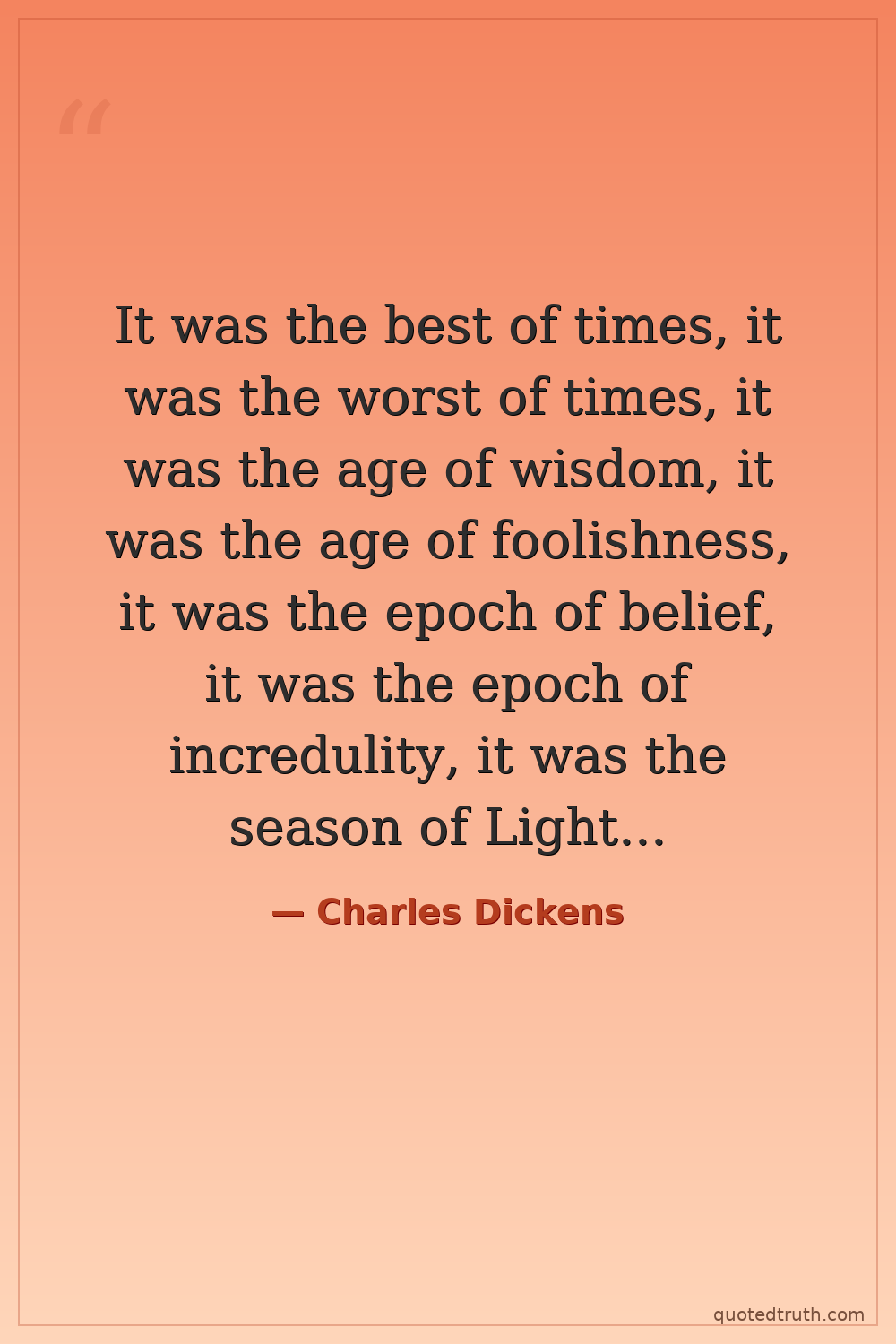 It was the best of times, it was the worst of times, it was the age of wisdom, it was the age of foolishness, it was the epoch of belief, it was the epoch of incredulity, it was the season of Light, it was the season of Darkness, it was the spring of hope, it was the winter of despair.