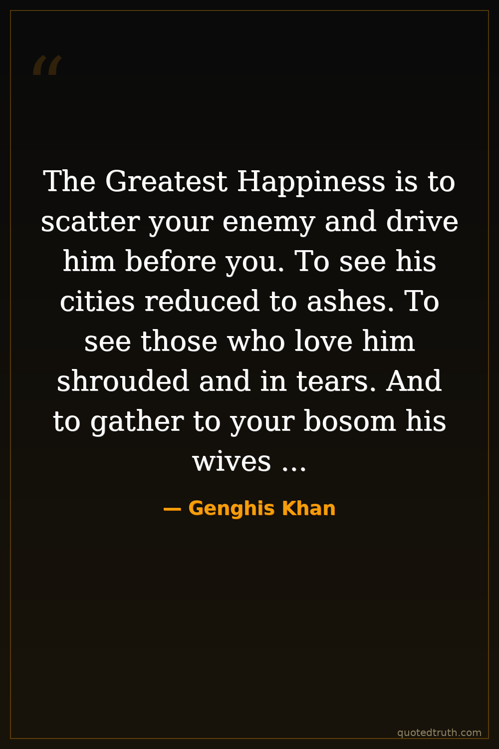 The Greatest Happiness is to scatter your enemy and drive him before you. To see his cities reduced to ashes. To see those who love him shrouded and in tears. And to gather to your bosom his wives and daughters.