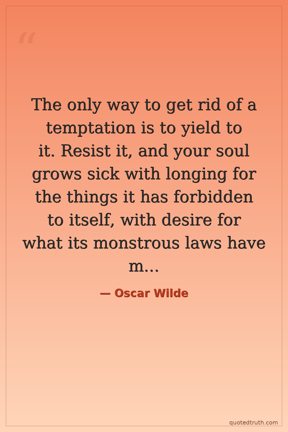 The only way to get rid of a temptation is to yield to it. Resist it, and your soul grows sick with longing for the things it has forbidden to itself, with desire for what its monstrous laws have made monstrous and unlawful.