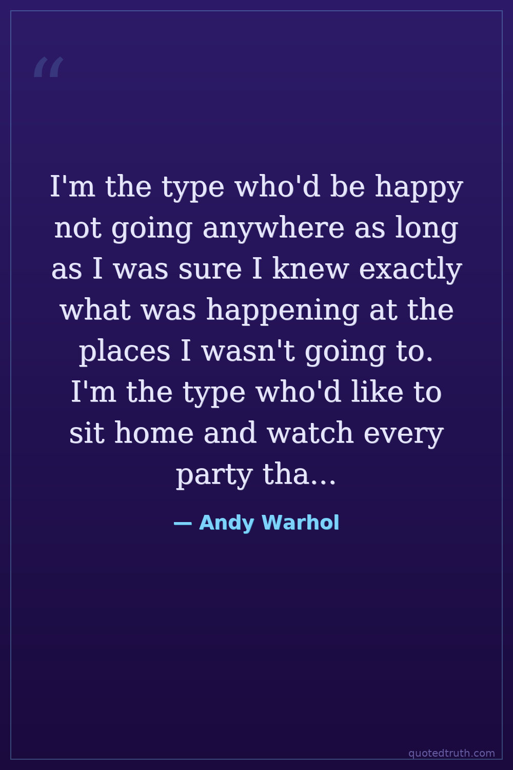 I'm the type who'd be happy not going anywhere as long as I was sure I knew exactly what was happening at the places I wasn't going to. I'm the type who'd like to sit home and watch every party that I'm invited to on a monitor in my bedroom.