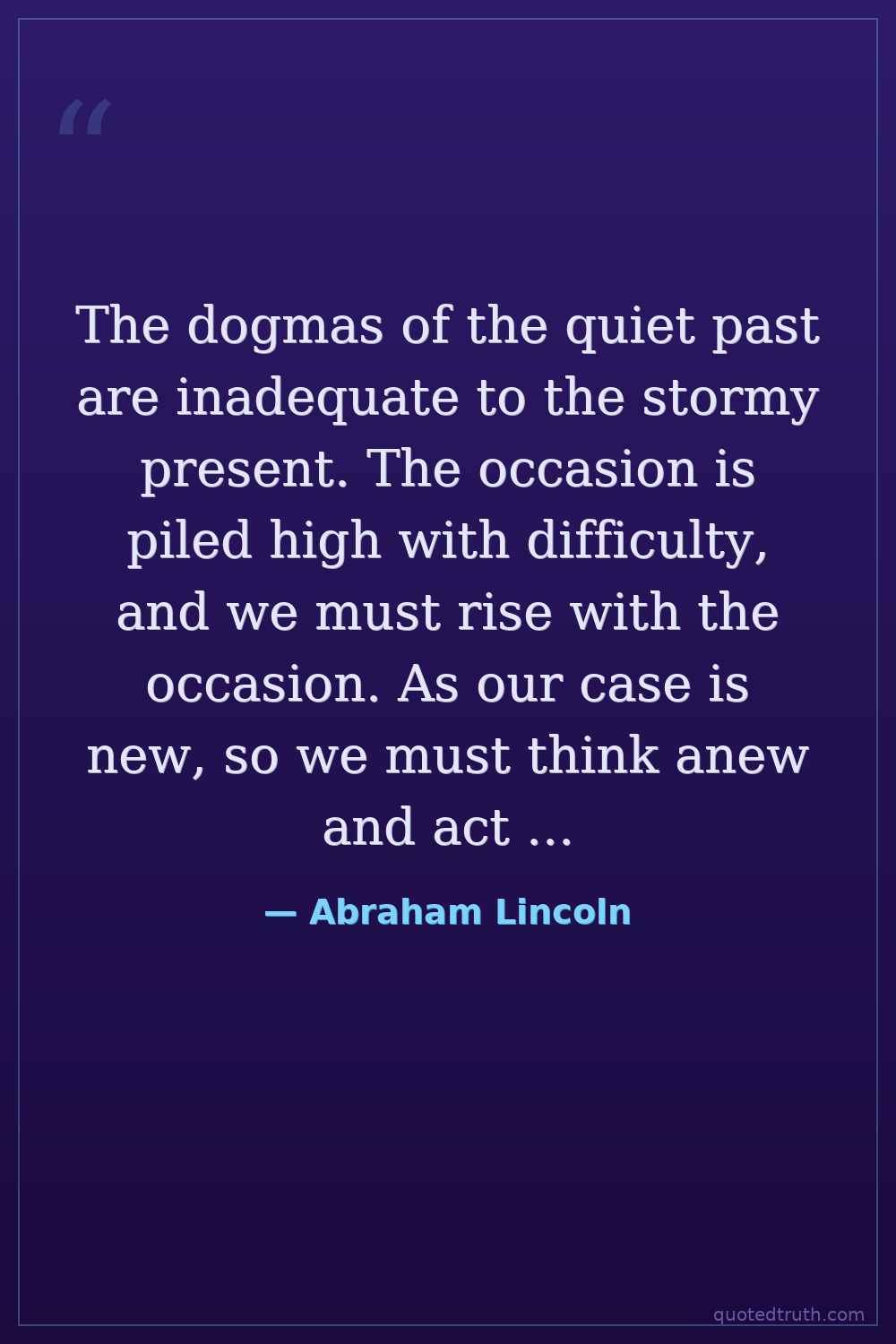 The dogmas of the quiet past are inadequate to the stormy present. The occasion is piled high with difficulty, and we must rise with the occasion. As our case is new, so we must think anew and act anew. We must disenthrall ourselves, and then we shall save our country.