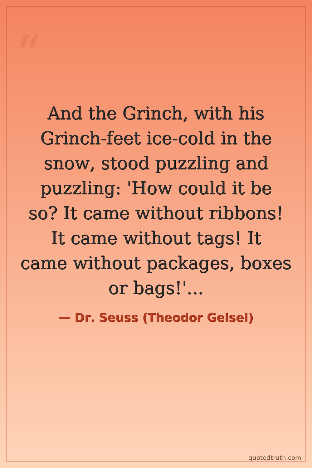 And the Grinch, with his Grinch-feet ice-cold in the snow, stood puzzling and puzzling: 'How could it be so? It came without ribbons! It came without tags! It came without packages, boxes or bags!' And he puzzled three hours, till his puzzler was sore. Then the Grinch thought of something he hadn't before! 'Maybe Christmas,' he thought, 'doesn't come from a store. Maybe Christmas...perhaps...means a little bit more!'