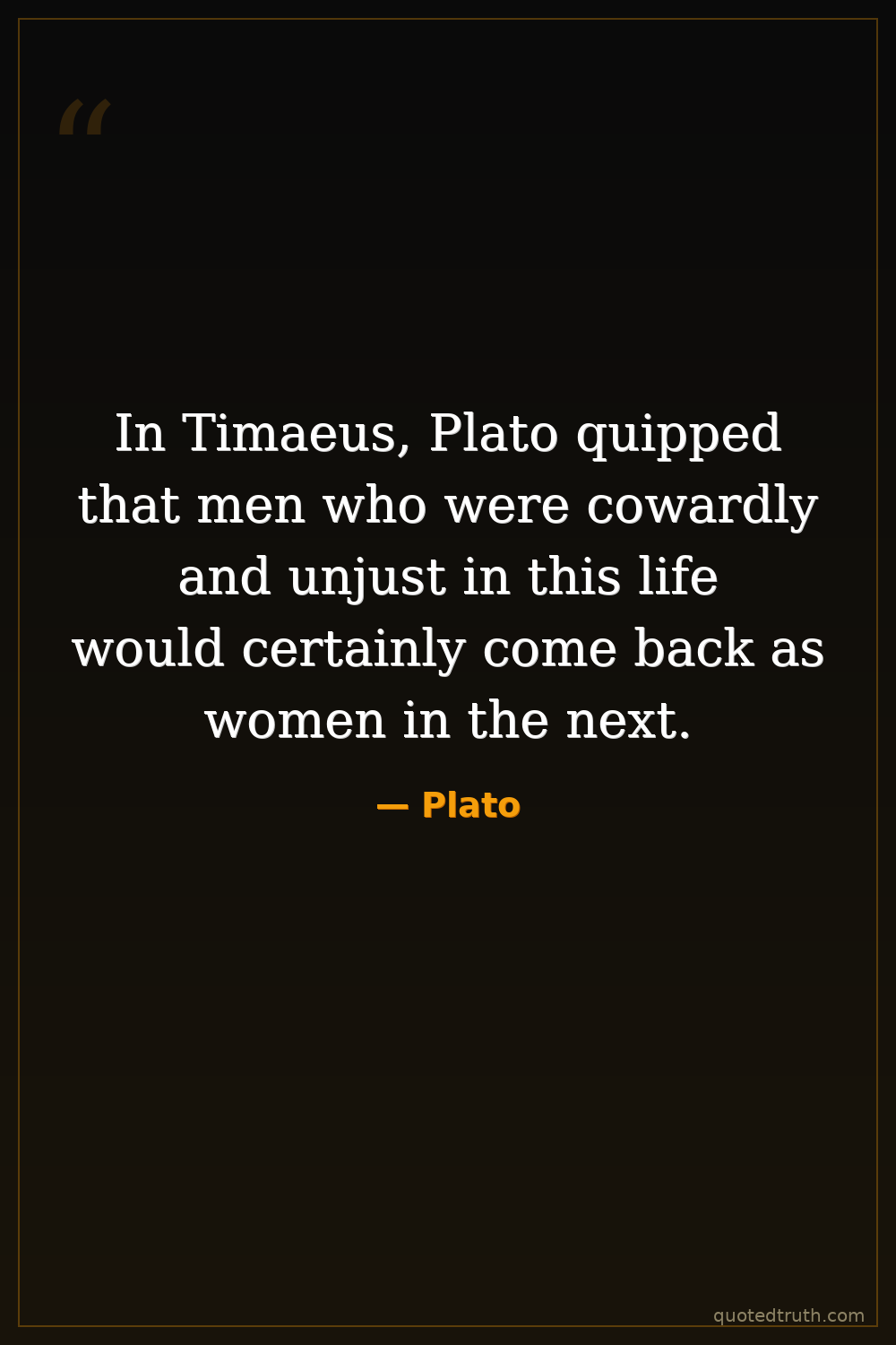 In Timaeus, Plato quipped that men who were cowardly and unjust in this life would certainly come back as women in the next.