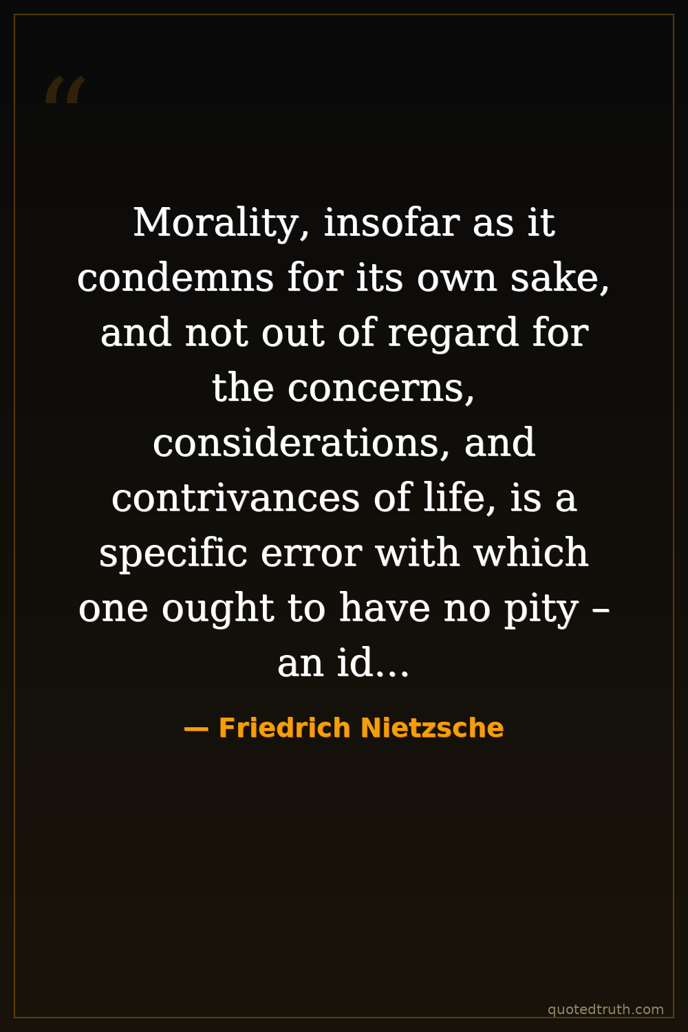 Morality, insofar as it condemns for its own sake, and not out of regard for the concerns, considerations, and contrivances of life, is a specific error with which one ought to have no pity – an idiosyncrasy of degenerates which has caused immeasurable harm.