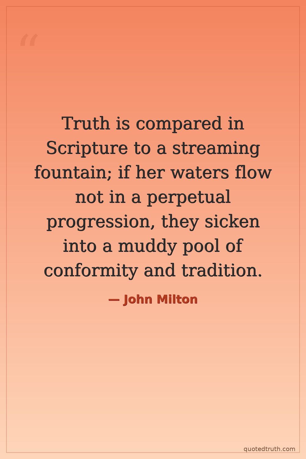 Truth is compared in Scripture to a streaming fountain; if her waters flow not in a perpetual progression, they sicken into a muddy pool of conformity and tradition.