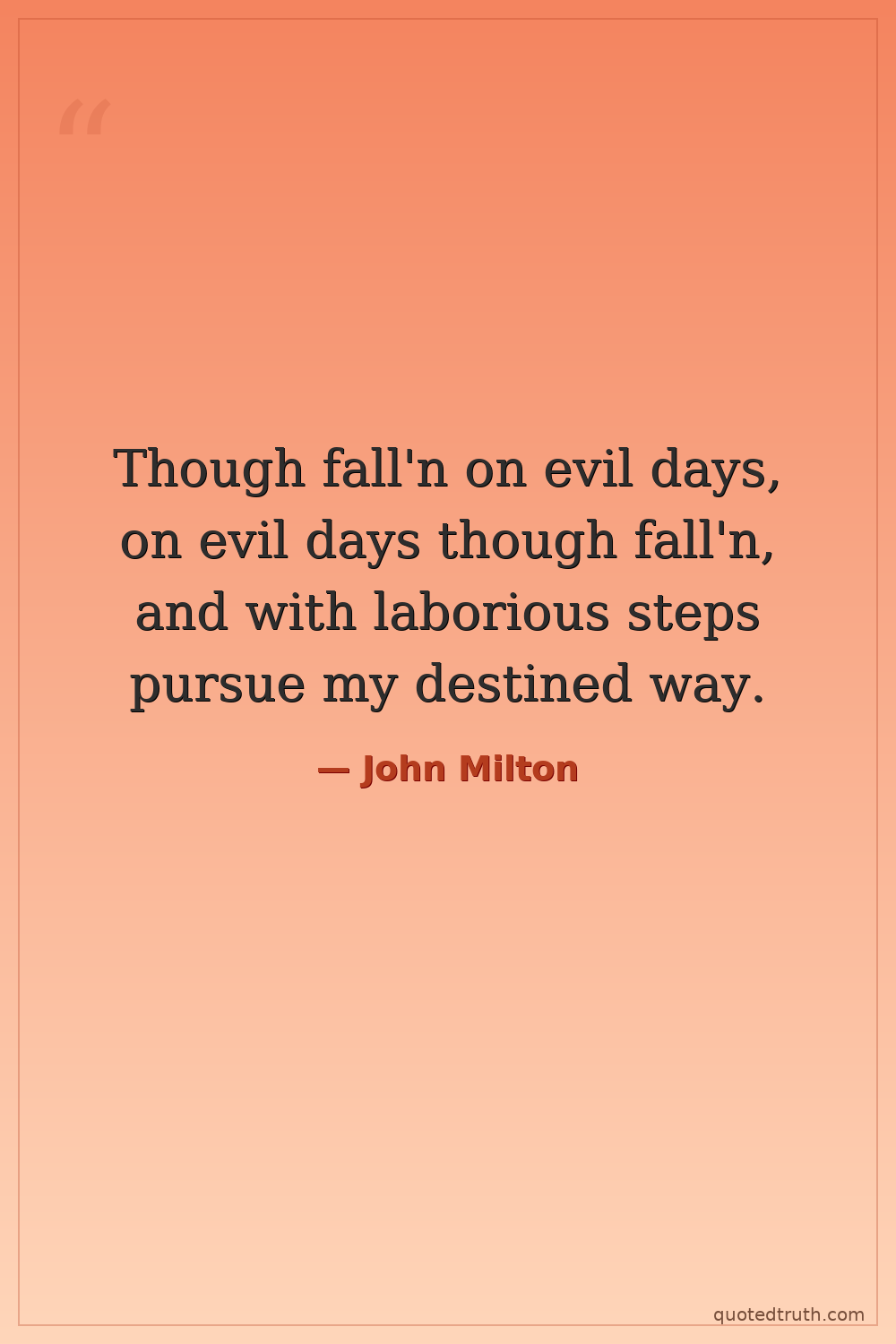 Though fall'n on evil days, on evil days though fall'n, and with laborious steps pursue my destined way.