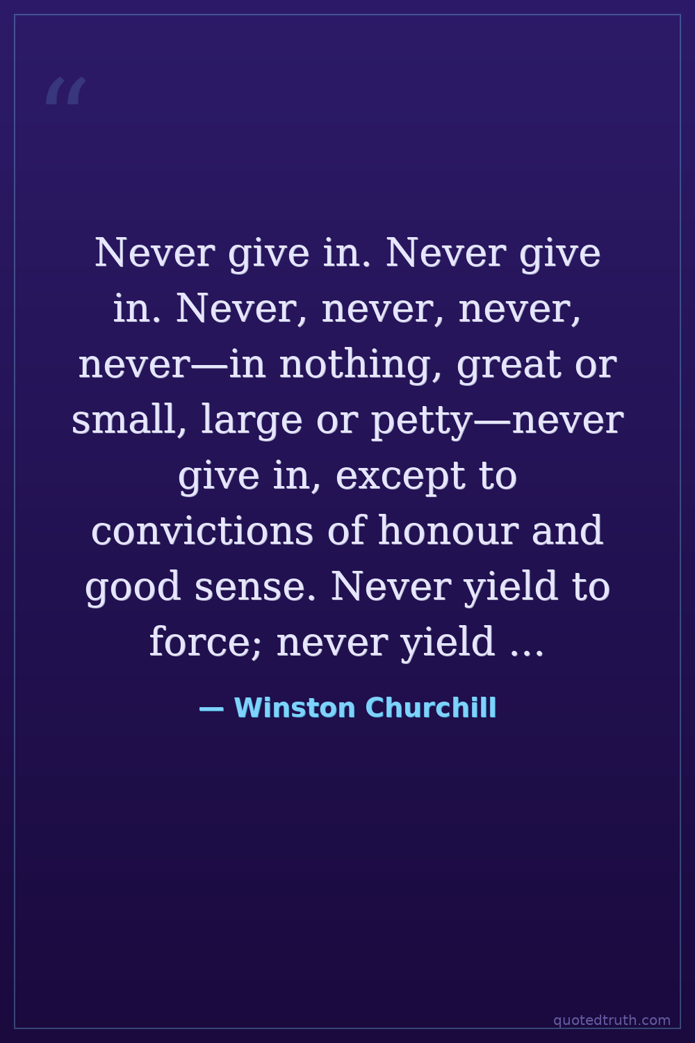 Never give in. Never give in. Never, never, never, never—in nothing, great or small, large or petty—never give in, except to convictions of honour and good sense. Never yield to force; never yield to the apparently overwhelming might of the enemy.