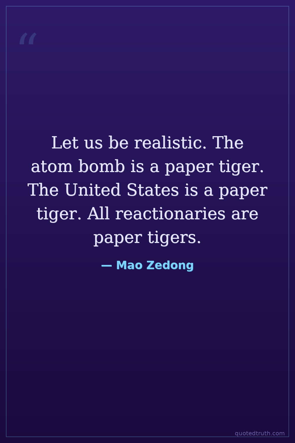 Let us be realistic. The atom bomb is a paper tiger. The United States is a paper tiger. All reactionaries are paper tigers.