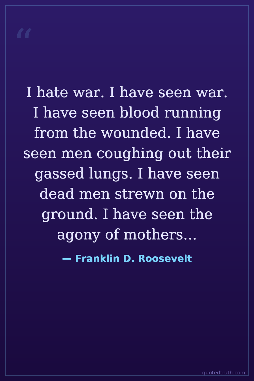 I hate war. I have seen war. I have seen blood running from the wounded. I have seen men coughing out their gassed lungs. I have seen dead men strewn on the ground. I have seen the agony of mothers and wives.