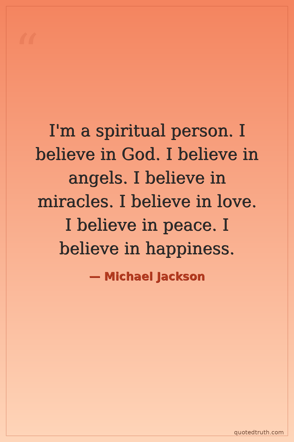 I'm a spiritual person. I believe in God. I believe in angels. I believe in miracles. I believe in love. I believe in peace. I believe in happiness.