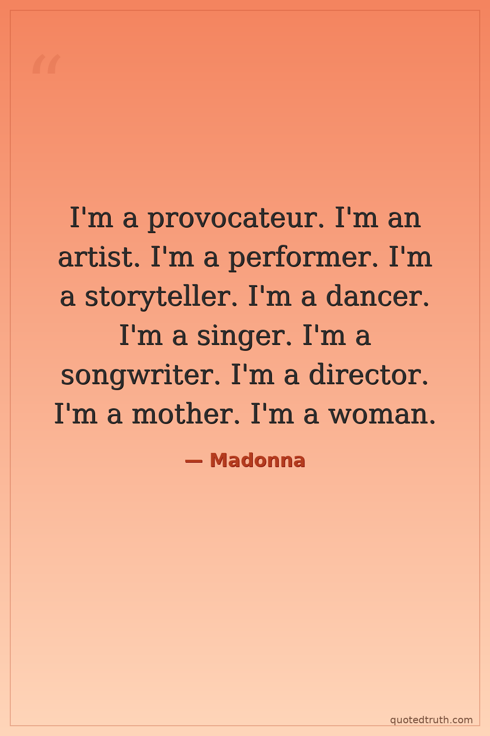 I'm a provocateur. I'm an artist. I'm a performer. I'm a storyteller. I'm a dancer. I'm a singer. I'm a songwriter. I'm a director. I'm a mother. I'm a woman.