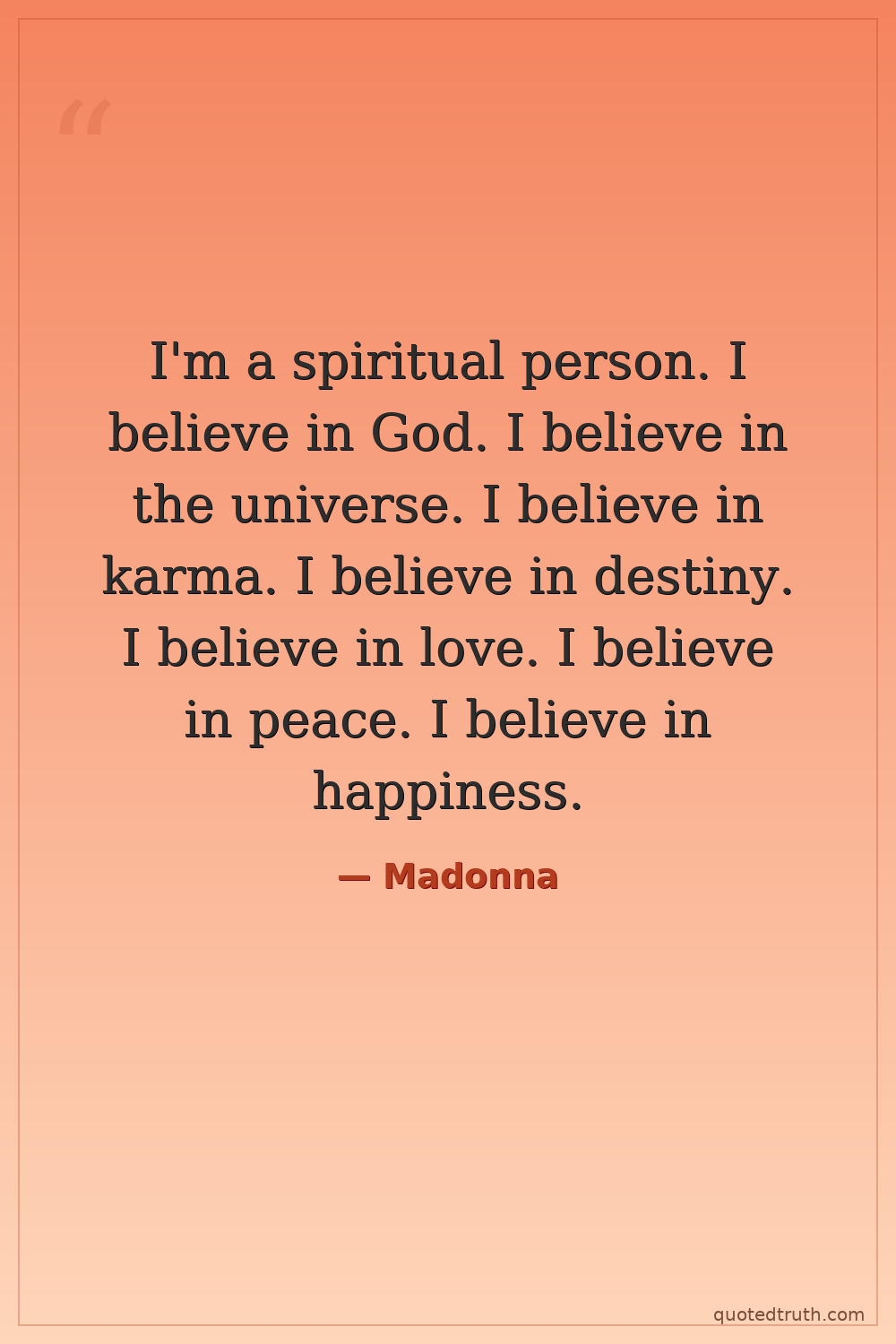I'm a spiritual person. I believe in God. I believe in the universe. I believe in karma. I believe in destiny. I believe in love. I believe in peace. I believe in happiness.