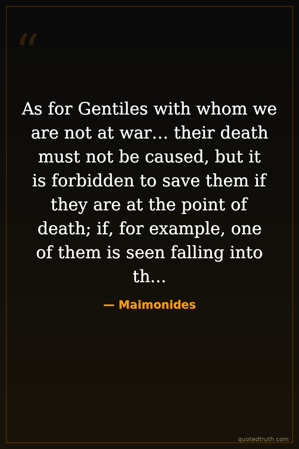 As for Gentiles with whom we are not at war… their death must not be caused, but it is forbidden to save them if they are at the point of death; if, for example, one of them is seen falling into the sea, he should not be rescued, for it is written: 'neither shalt thou stand against the blood of thy fellow'–but [a Gentile] is not thy fellow.
