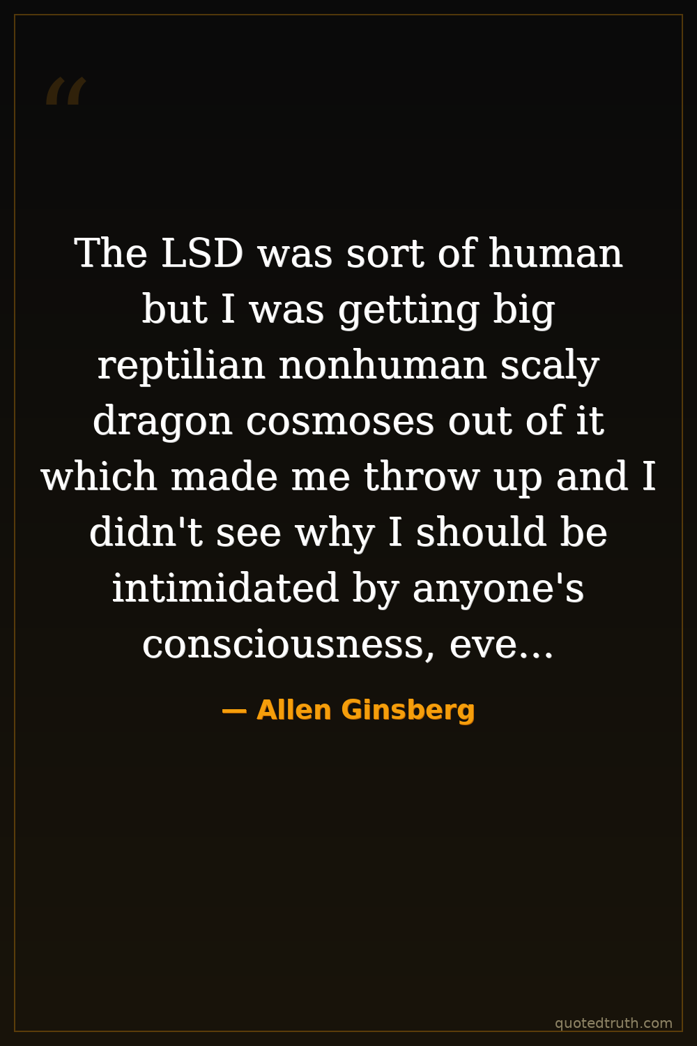 The LSD was sort of human but I was getting big reptilian nonhuman scaly dragon cosmoses out of it which made me throw up and I didn't see why I should be intimidated by anyone's consciousness, even my own…