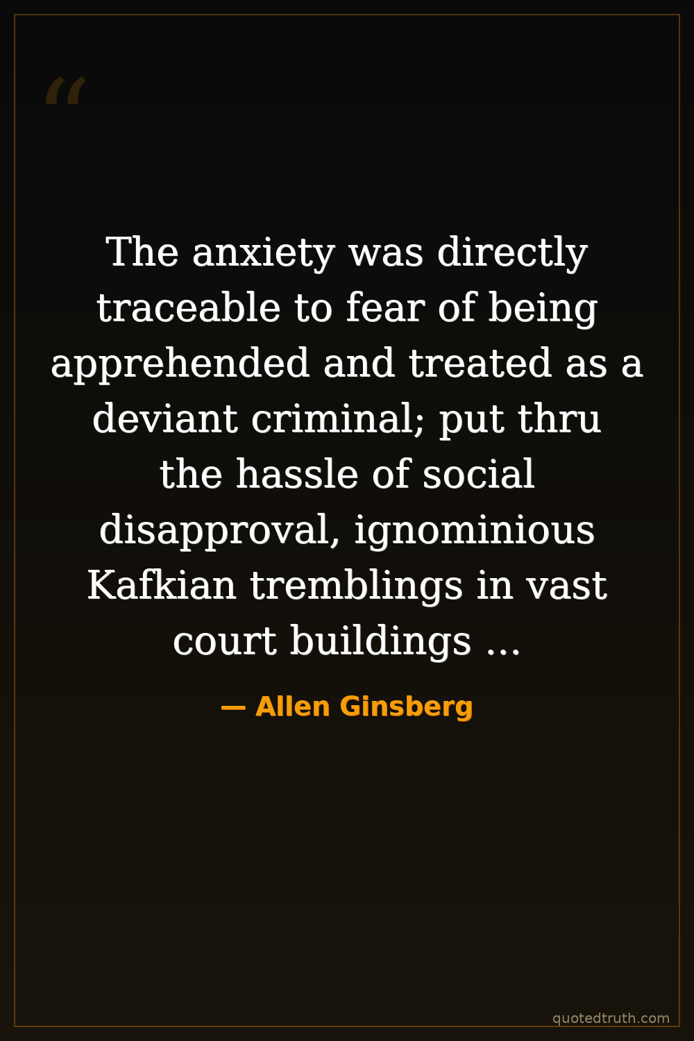 The anxiety was directly traceable to fear of being apprehended and treated as a deviant criminal; put thru the hassle of social disapproval, ignominious Kafkian tremblings in vast court buildings coming to be judged, the helplessness of being overwhelmed by force or threat of deadly force and put in brick & iron cell.