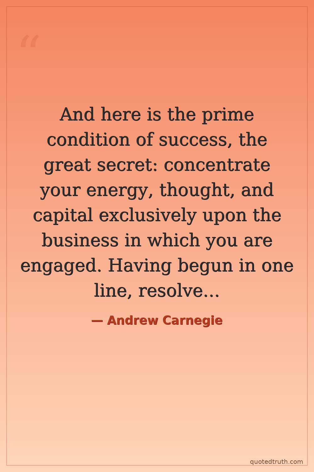 And here is the prime condition of success, the great secret: concentrate your energy, thought, and capital exclusively upon the business in which you are engaged. Having begun in one line, resolve to fight it out on that line, to lead in it, adopt every improvement, have the best machinery, and thus produce at the lowest cost.