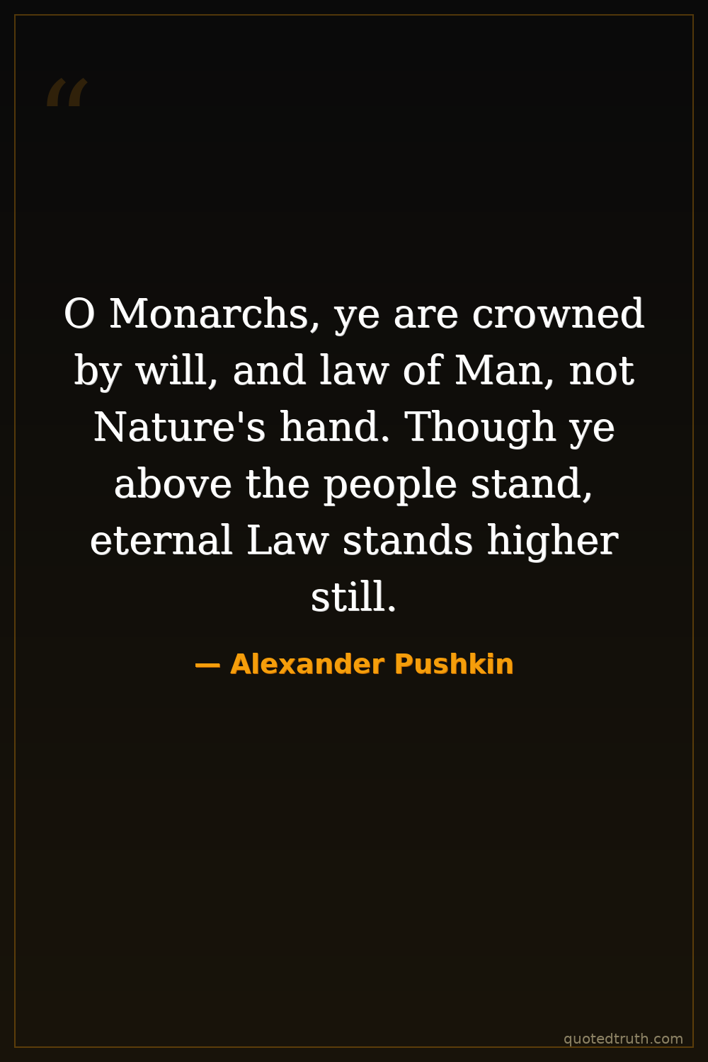 O Monarchs, ye are crowned by will, and law of Man, not Nature's hand. Though ye above the people stand, eternal Law stands higher still.