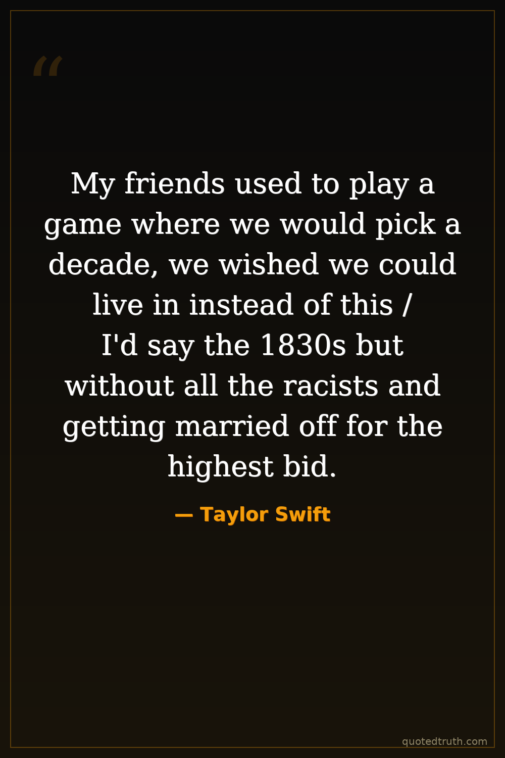 My friends used to play a game where we would pick a decade, we wished we could live in instead of this / I'd say the 1830s but without all the racists and getting married off for the highest bid.
