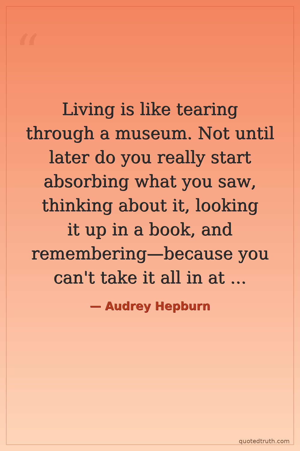 Living is like tearing through a museum. Not until later do you really start absorbing what you saw, thinking about it, looking it up in a book, and remembering—because you can't take it all in at once.