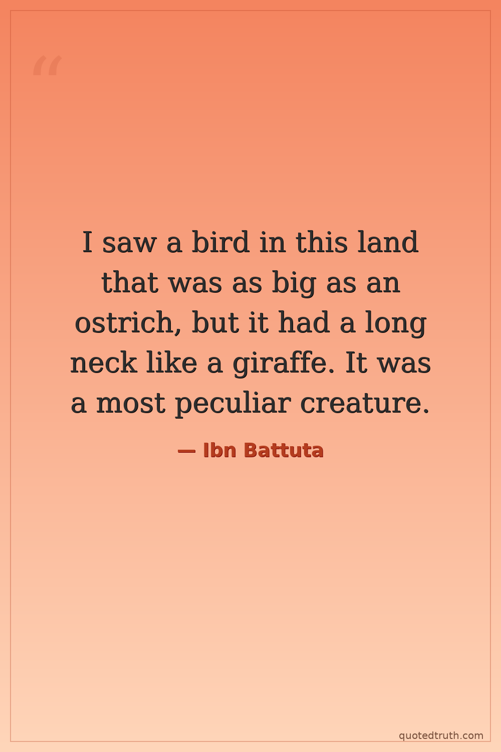 I saw a bird in this land that was as big as an ostrich, but it had a long neck like a giraffe. It was a most peculiar creature.