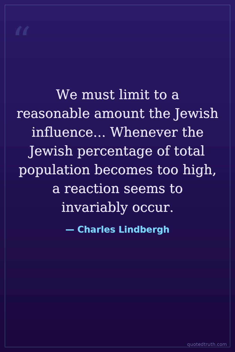 We must limit to a reasonable amount the Jewish influence... Whenever the Jewish percentage of total population becomes too high, a reaction seems to invariably occur.