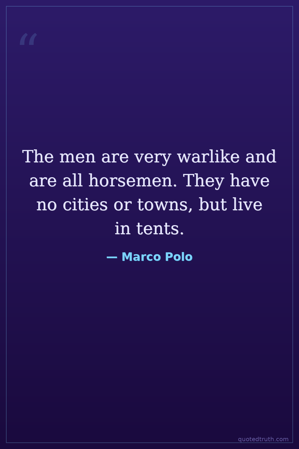 The men are very warlike and are all horsemen. They have no cities or towns, but live in tents.