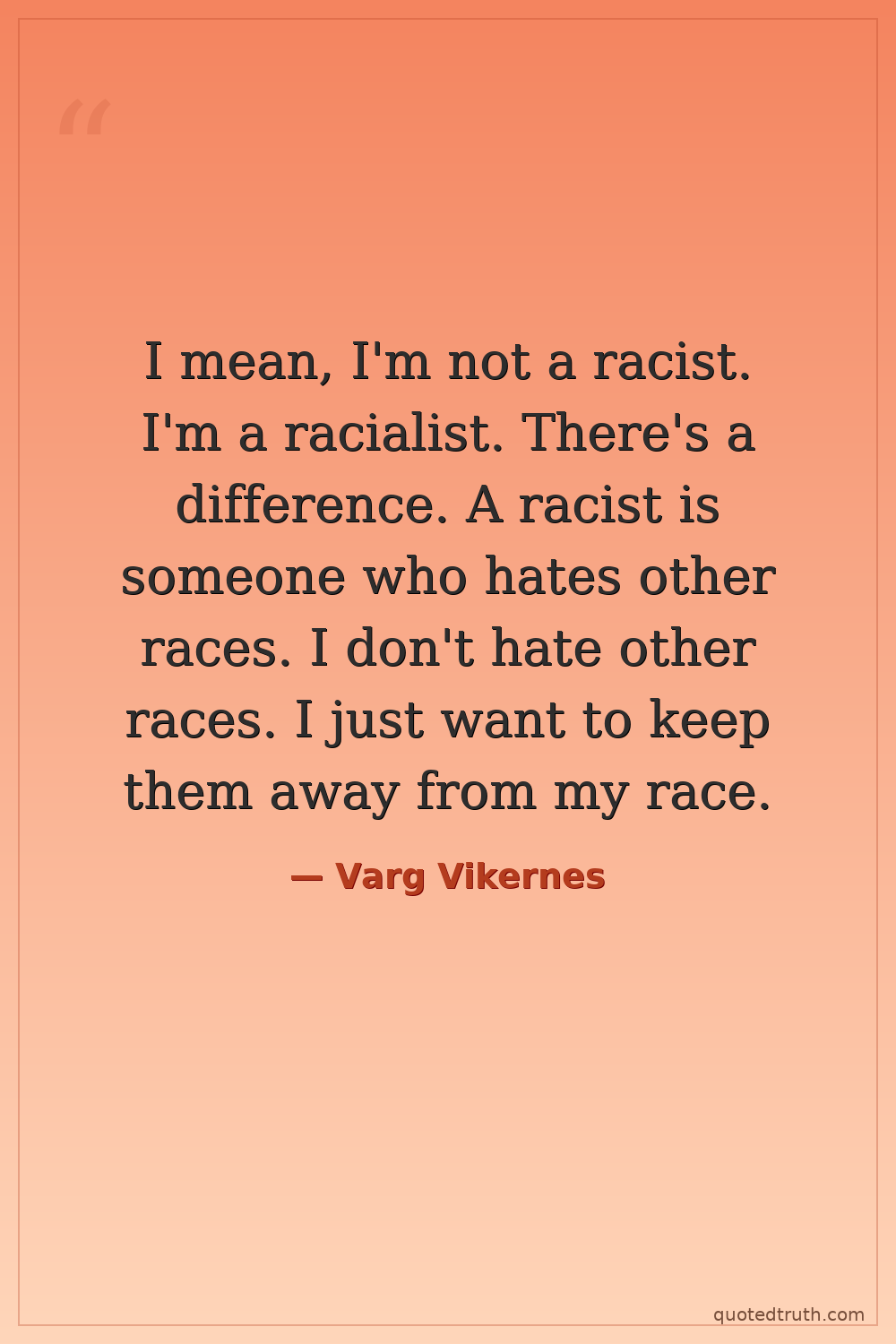 I mean, I'm not a racist. I'm a racialist. There's a difference. A racist is someone who hates other races. I don't hate other races. I just want to keep them away from my race.