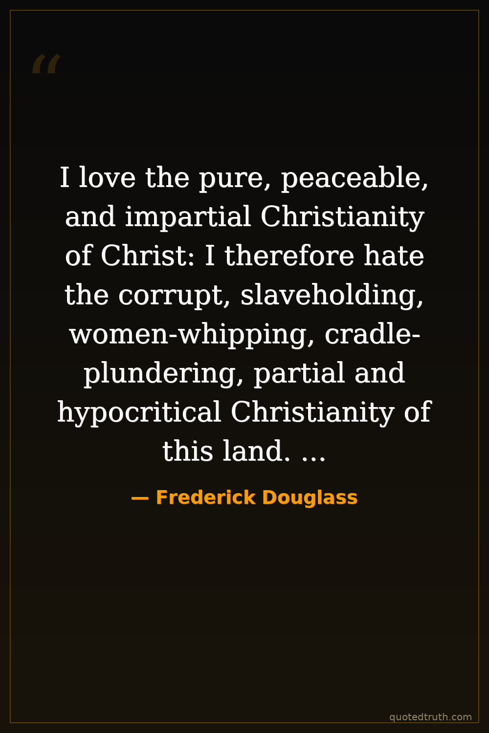 I love the pure, peaceable, and impartial Christianity of Christ: I therefore hate the corrupt, slaveholding, women-whipping, cradle-plundering, partial and hypocritical Christianity of this land. Indeed, I can see no reason, but the most deceitful one, for calling the religion of this land Christianity. I look upon it as the climax of all misnomers, the boldest of all frauds, and the grossest of all libels.