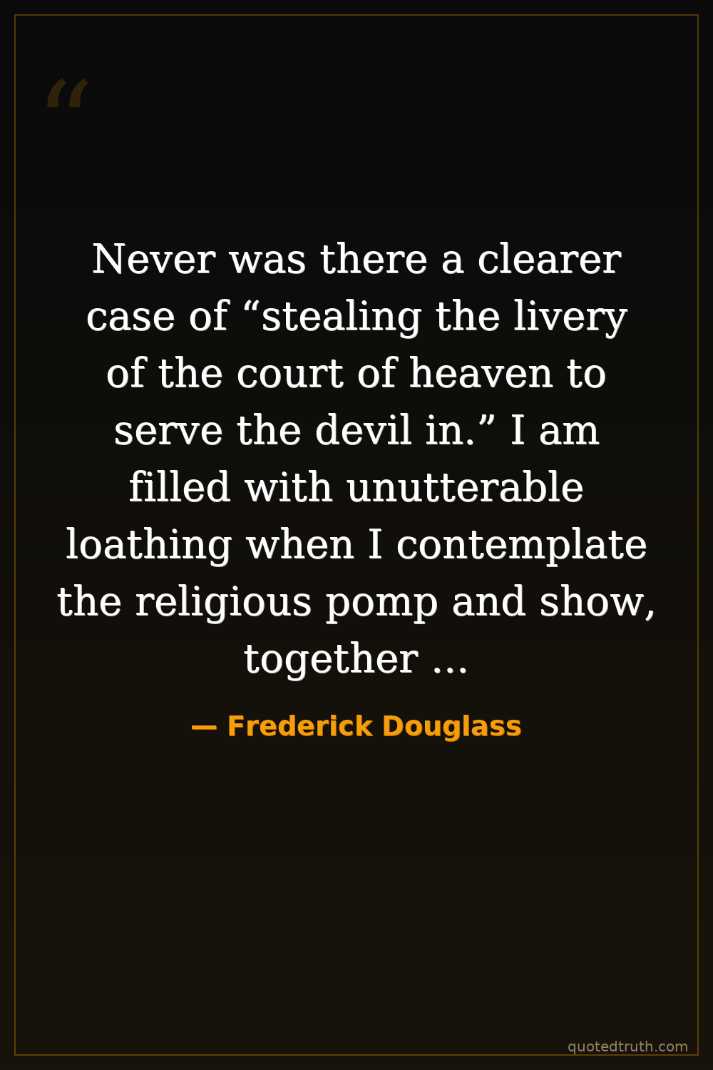 Never was there a clearer case of “stealing the livery of the court of heaven to serve the devil in.” I am filled with unutterable loathing when I contemplate the religious pomp and show, together with the horrible inconsistencies, which every where surround me.