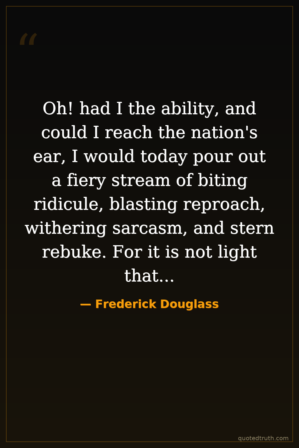 Oh! had I the ability, and could I reach the nation's ear, I would today pour out a fiery stream of biting ridicule, blasting reproach, withering sarcasm, and stern rebuke. For it is not light that is needed, but fire; it is not the gentle shower, but thunder. We need the storm, the whirlwind, and the earthquake.