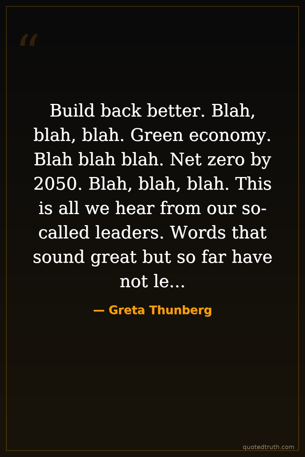 Build back better. Blah, blah, blah. Green economy. Blah blah blah. Net zero by 2050. Blah, blah, blah. This is all we hear from our so-called leaders. Words that sound great but so far have not led to action. Our hopes and ambitions drown in their empty promises.