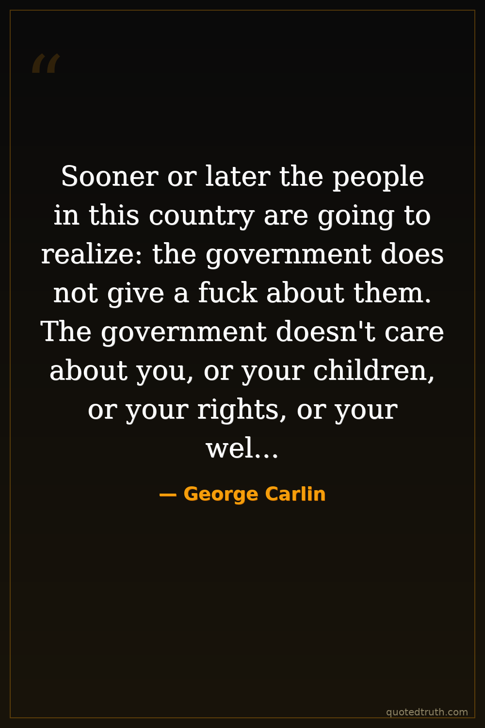 Sooner or later the people in this country are going to realize: the government does not give a fuck about them. The government doesn't care about you, or your children, or your rights, or your welfare, or your safety. It simply doesn't give a fuck about you. It's interested in its own power. That's the only thing keeping it and expanding it wherever possible.