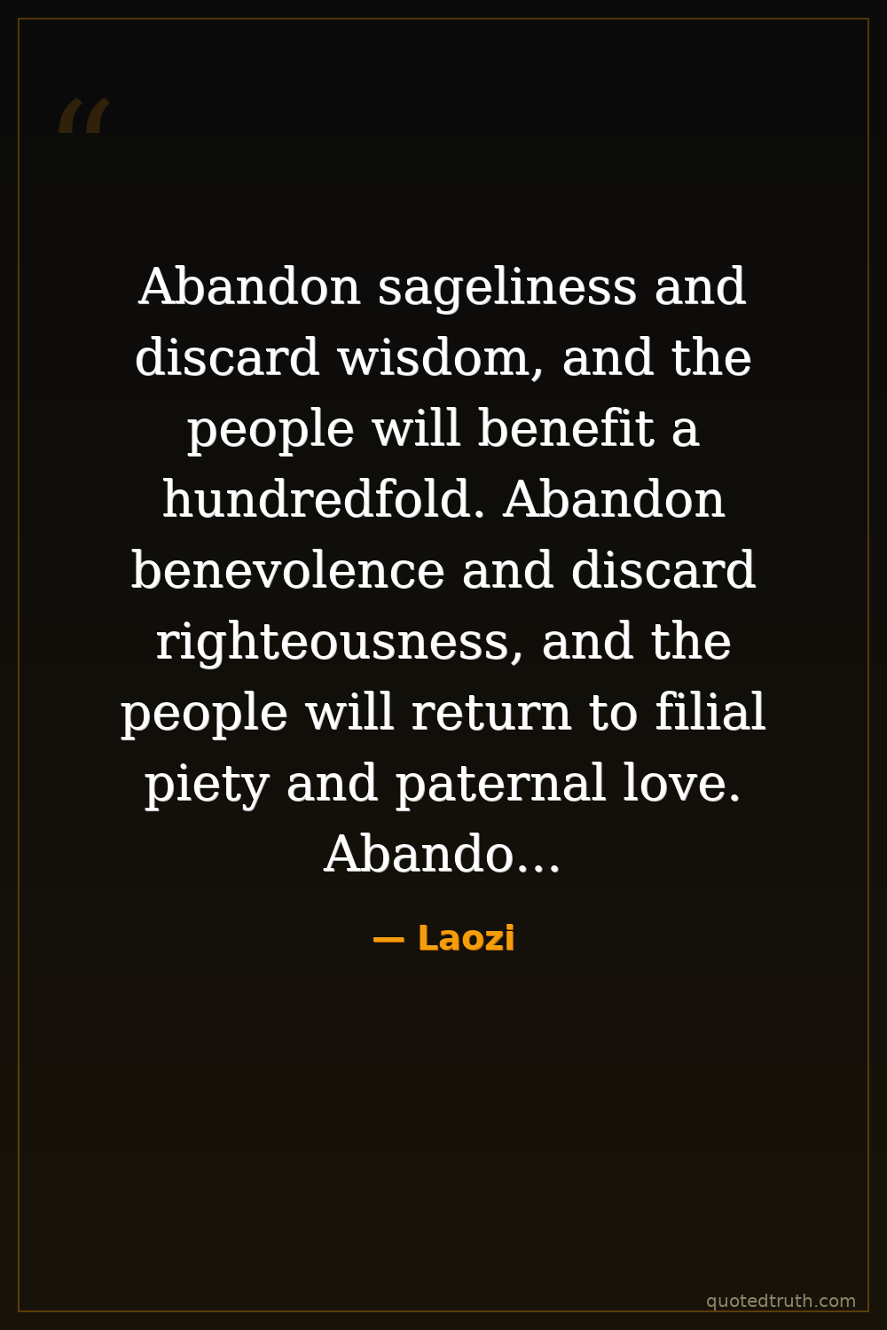 Abandon sageliness and discard wisdom, and the people will benefit a hundredfold. Abandon benevolence and discard righteousness, and the people will return to filial piety and paternal love. Abandon skill and discard profit, and there will be no thieves or robbers.