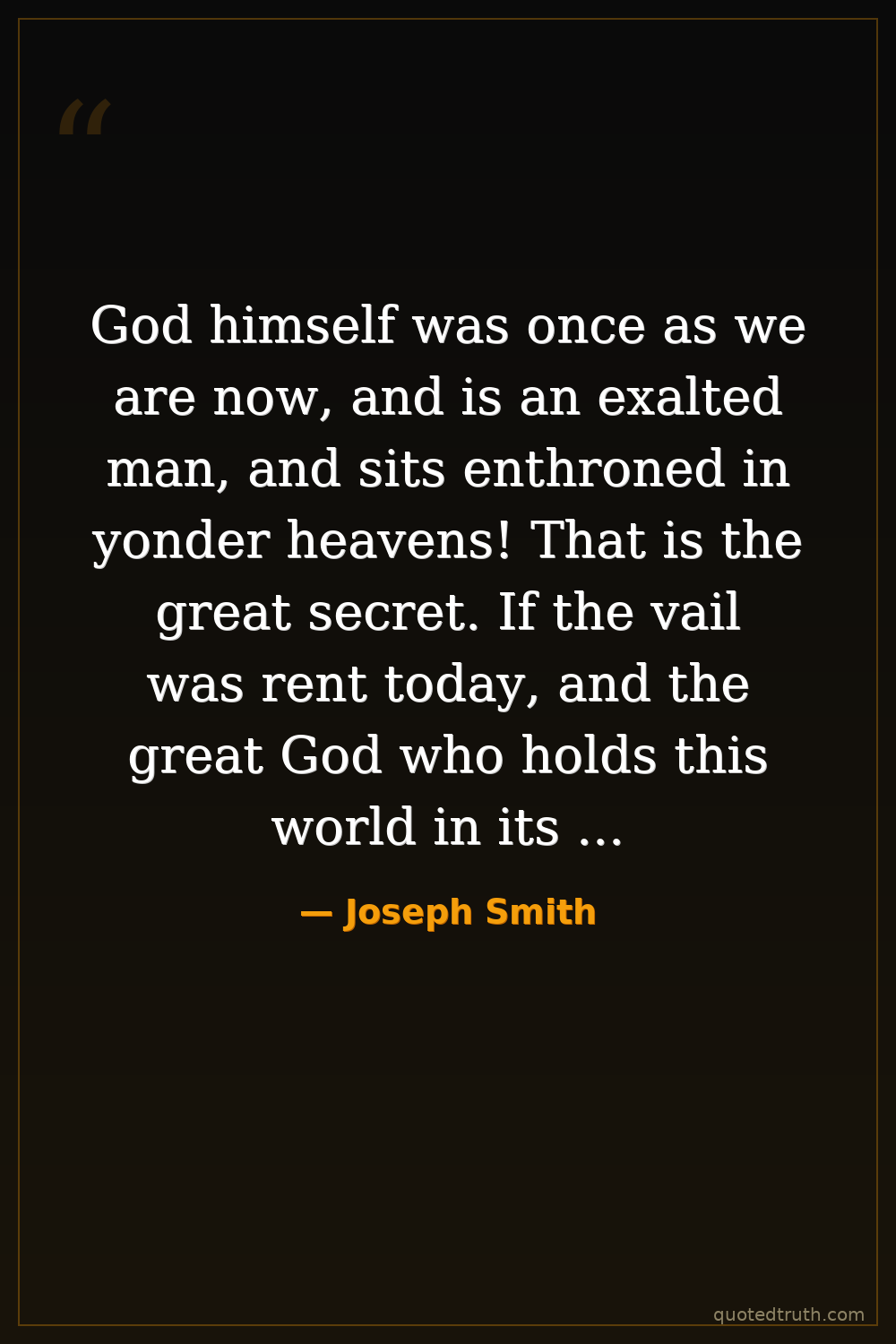 God himself was once as we are now, and is an exalted man, and sits enthroned in yonder heavens! That is the great secret. If the vail was rent today, and the great God who holds this world in its orbit, and who sustains all worlds and all things by His power, was to make himself visible, I say, if you were to see Him today, you would see Him like a man in form—like yourselves in all the person, image, and very form as a man.