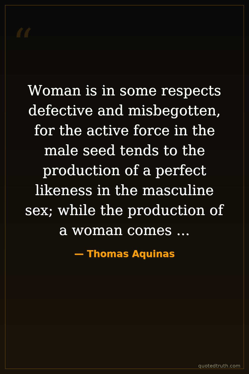 Woman is in some respects defective and misbegotten, for the active force in the male seed tends to the production of a perfect likeness in the masculine sex; while the production of a woman comes from a defect in the active force, or from some material indisposition, or even from some external change, such as that of the south wind, which is moist, as the Philosopher observes.