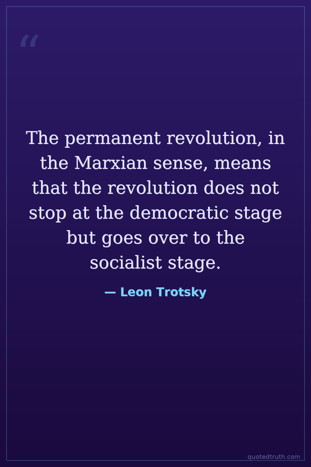 The permanent revolution, in the Marxian sense, means that the revolution does not stop at the democratic stage but goes over to the socialist stage.